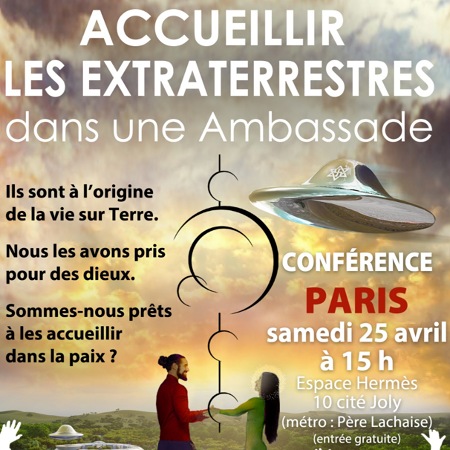 « Accueillir les Extraterrestres dans une Ambassade »Une conférence est organisée par le Mouvement raélien à Paris le 25 avril 2025/ 80aH* à 15h